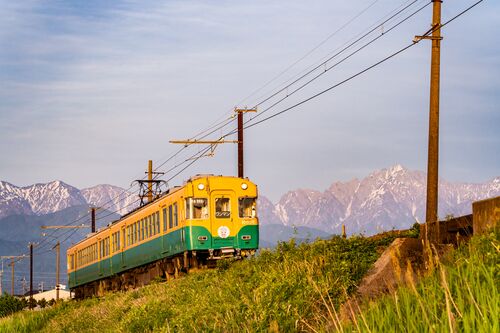 こんばんわ♪ 今日は雨の1日でしたね。万歩計の数字は、520歩でした(笑)。 写真は、富山地鉄本線を走る地鉄電車。5月18日、富山市内での撮影です。 初夏の夕暮れ 坂を登ってやってきた電車の顔が夕日に照らされています。 19時前、劔岳の上の雲が染まっていき…