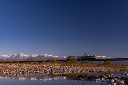 こんばんは♪ 今日は冷たい雨の一日でしたね。 写真は、いつもの常願寺川橋梁を渡る富山地鉄の電車。 秋も深まり、河原の草はすっかり茶色になりました。 スッキリ晴れた11/21の撮影です。 晩秋を駆ける だいこん電車がやってきました。右上には半月が。 電…