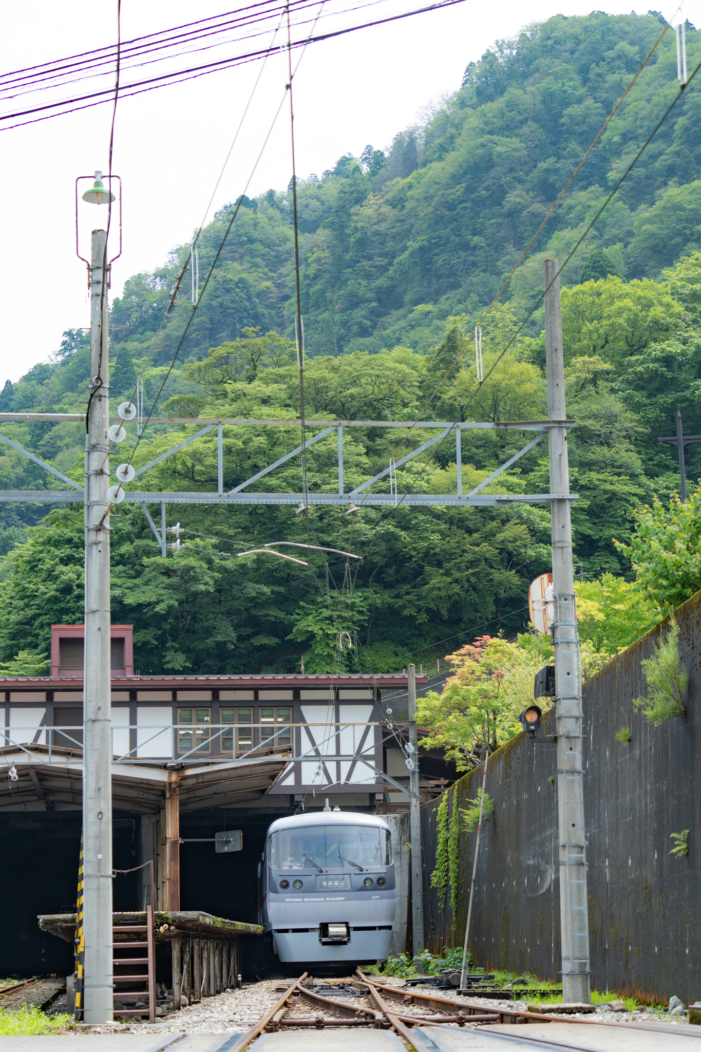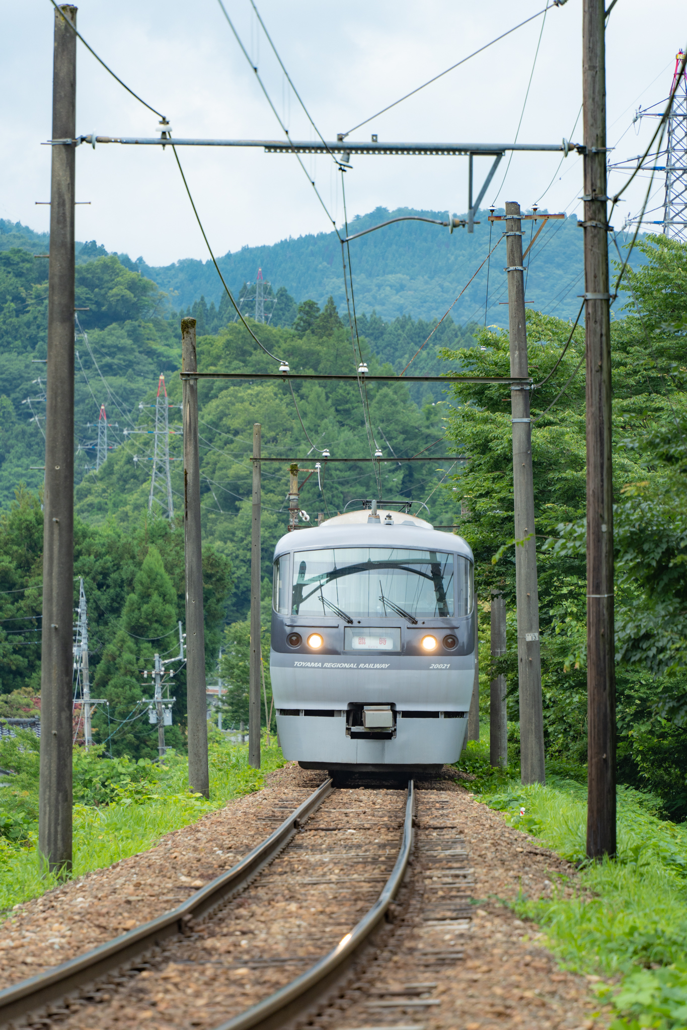カーブを曲がってやってきました。立山線、有峰口~本宮間の鳥越踏切あたりで。