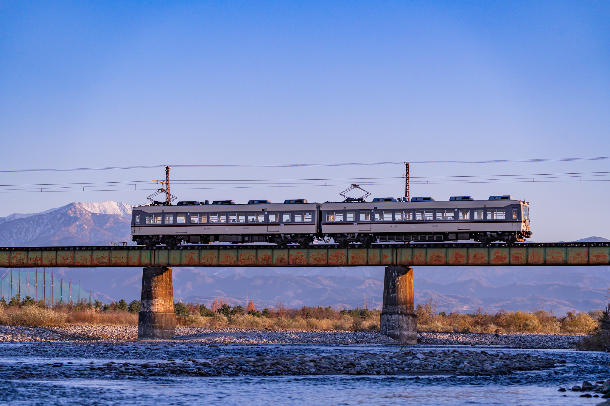写真は、夕暮れ時の富山地鉄。雪をかぶった北アルプスや晩秋の木々がオレンジ色に染まってました。