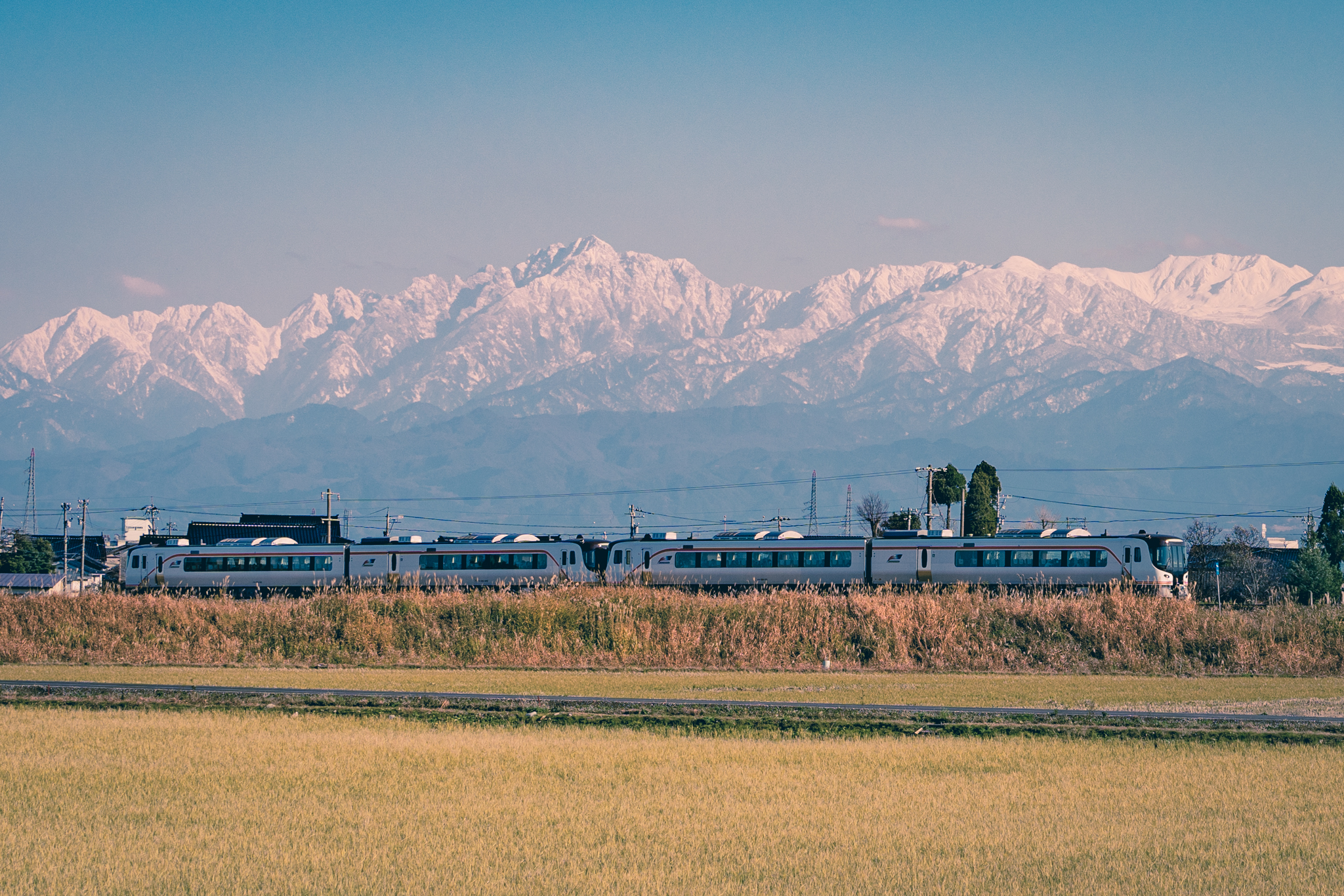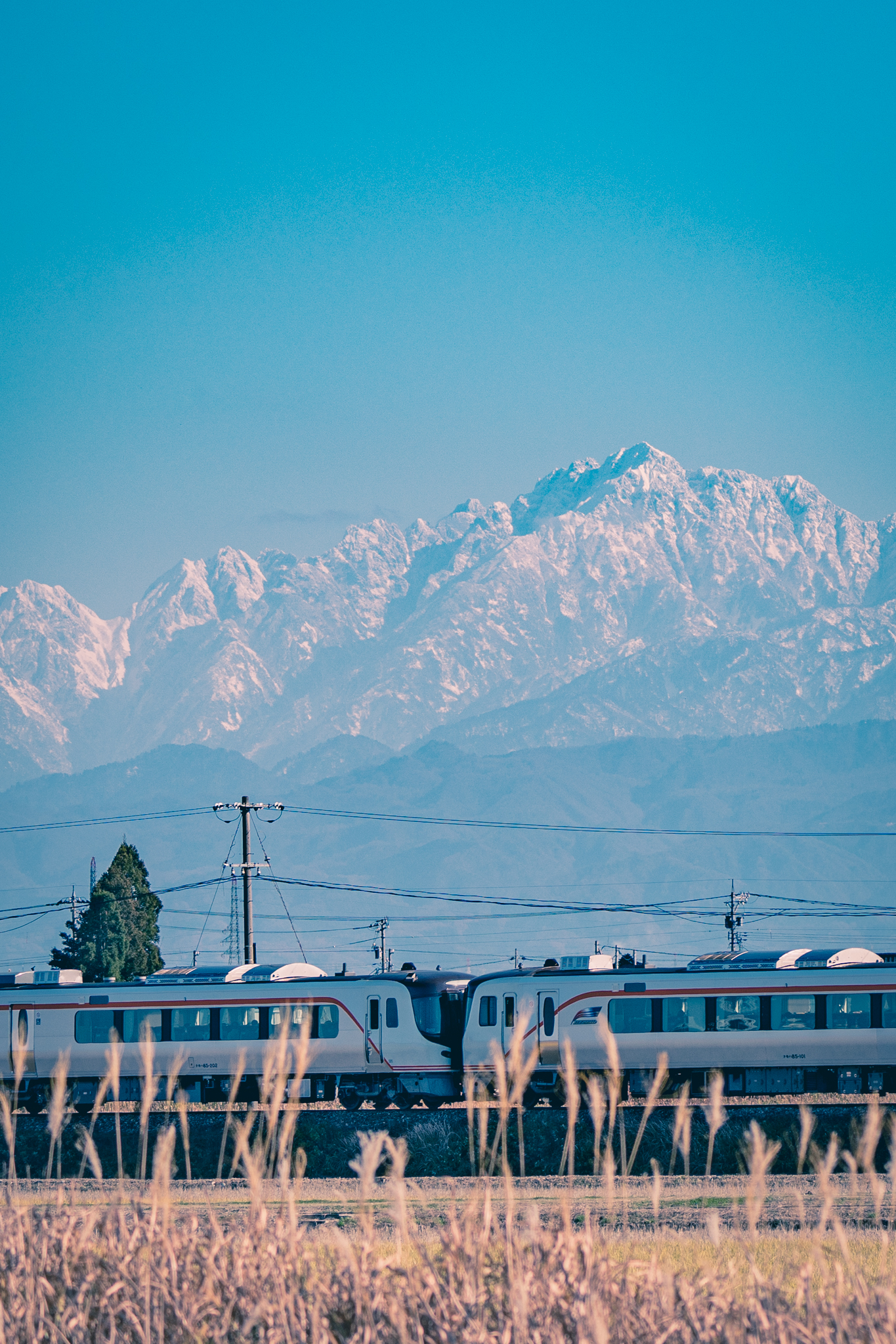 写真は、立山連峰を背景に走る特急ひだの新車両(HC85系)です。