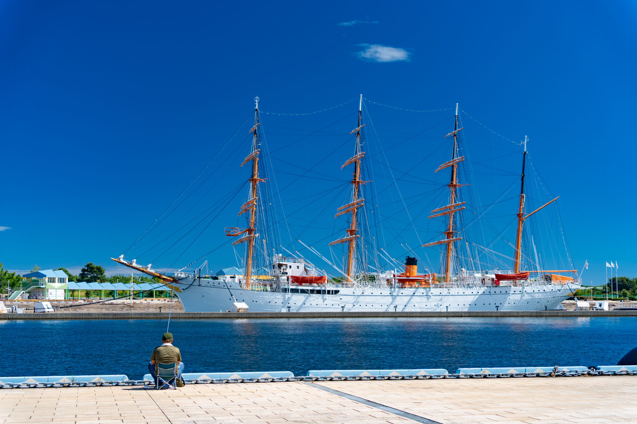 わずかな雲と、どこまでも青い空、船の白さが際立っています。