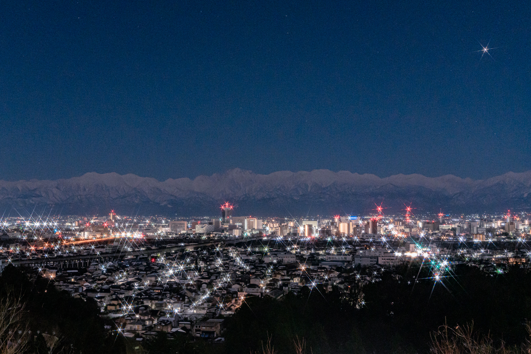 朝の5時20分、山々が白く浮かび上がっていました。クロスフィルターを使用しています。右上は金星です。