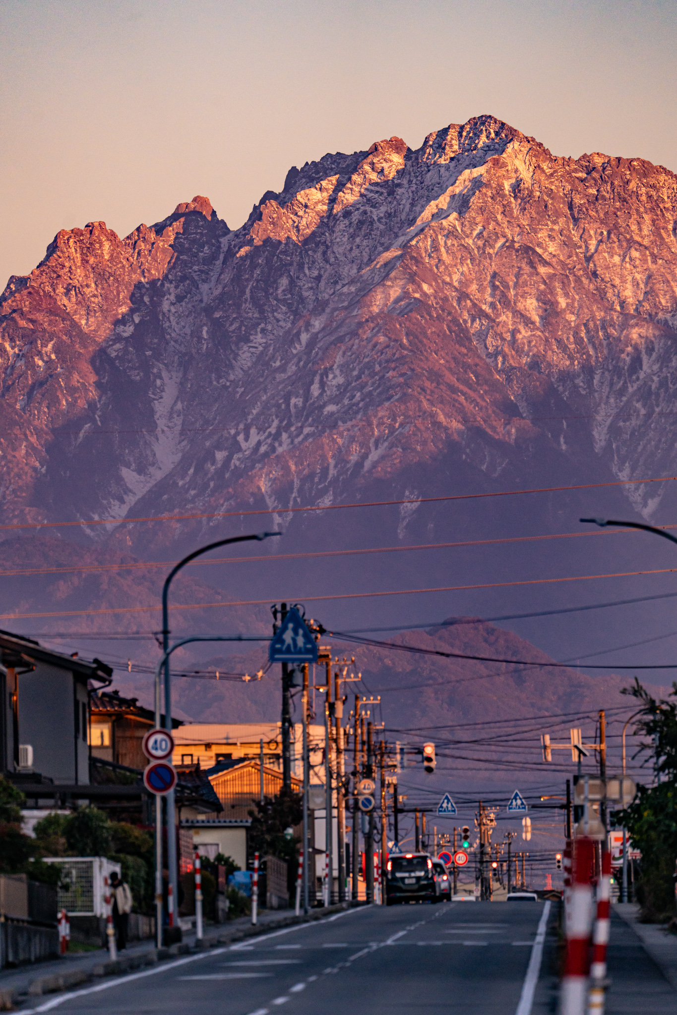 どっしりとした紅劔 、富山市城川原から。どっしりとした劔岳が迫ってくるような街ですね。 初冠雪の山肌に夕日があたり、紅色の紅劔になっていきました。11/12の投稿です。