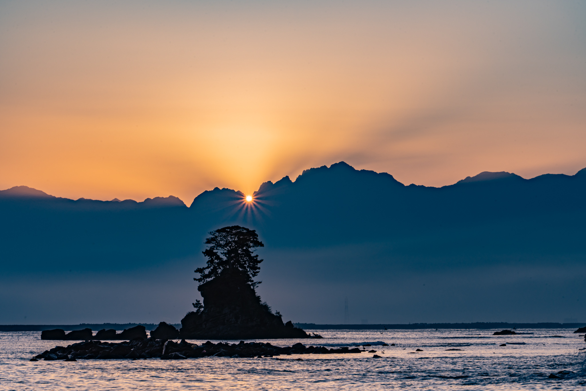 雨晴海岸のダイヤモンド剱。日の出は、小窓からで、ダイヤモンドにはなりましたが、いくつかに分割するティアラ劔にはなりませんでした。11/4の投稿です。