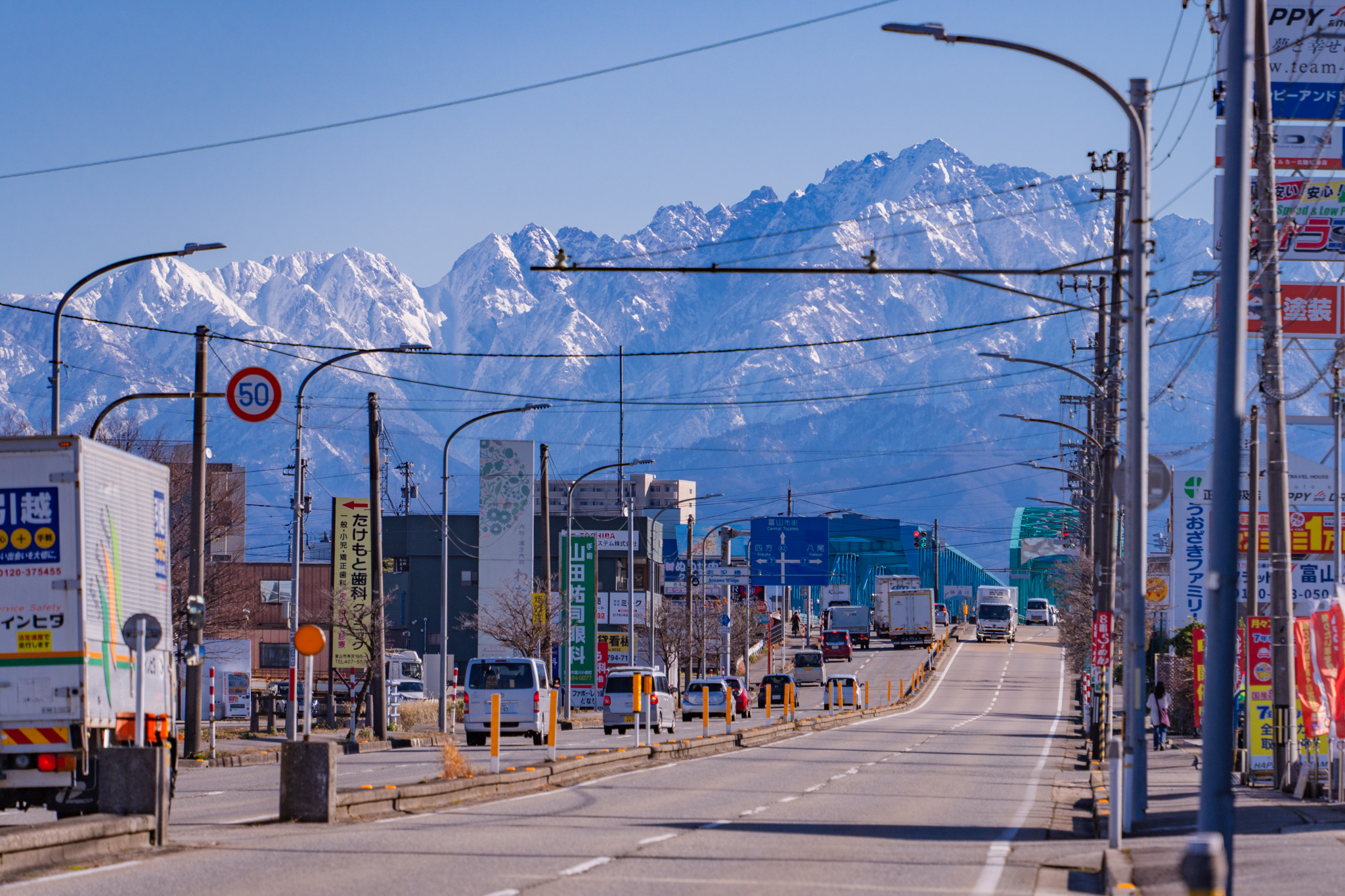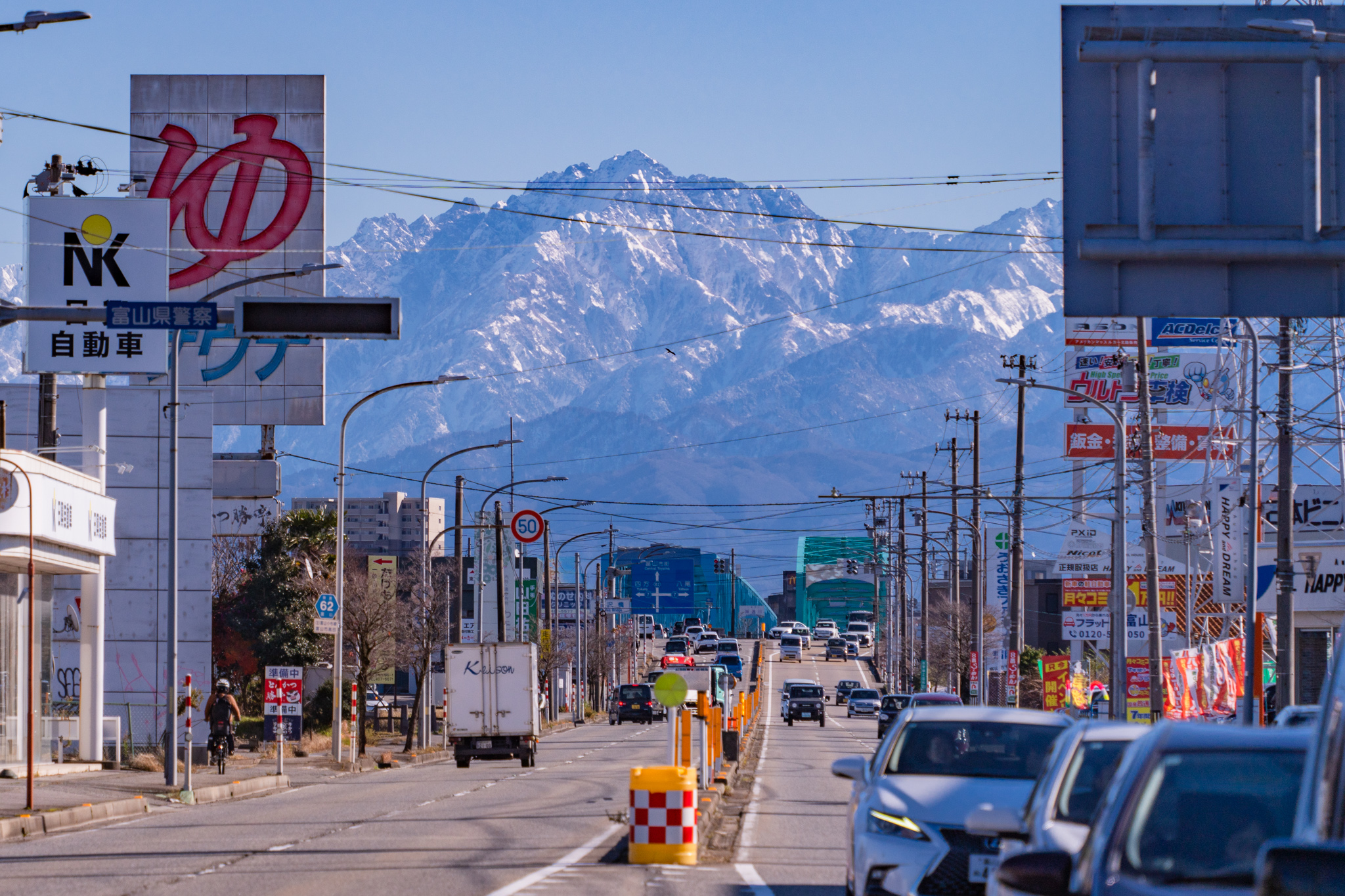たくさんの電線や看板といったごちゃごちゃした景色の向こうに、ゴツゴツした山肌の劔岳が凛としてそびえています。